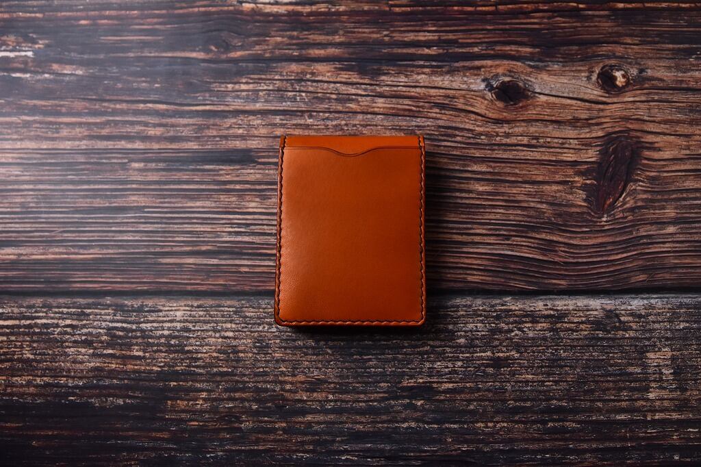背面と内側にカード・名刺ポケット2つタイプ。色はオレンジ。